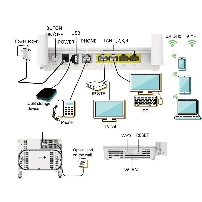 چهار پورت شبکه از نوع گیگ(10/100/1000), دو پورت USB ,یک پورت تلفن , و پورت GPON از نوع UPC (ابی رنگ )پنل مدیریتی تحت وب میباشد .پس از درخواست اولیه مشترکین و امکان سنجی توسط مخابرات و فراهم شدن امکانات فیبر نوری در محل مشترکین اعم از خانگی , تجاری , اداری ,صنعتی تهیه مودم فیبر نوری مناسب اصلی ترین دقدقه مشترکین است بنابر این در مرحله اول بایستی